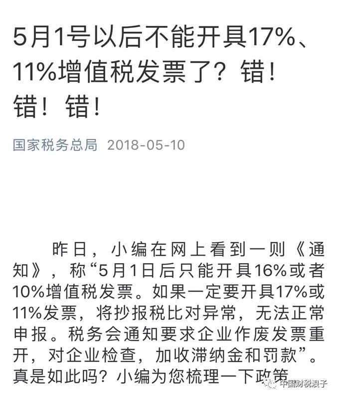 2018年5月10日下午6点34分,国家税务总局的官方微信发布了一则辟谣微信《5月1号以后不能开具17%、11%增值税发票了?错!错!错!》。你可不要小看这条微信,微信的作者署名非常清楚就是“国家税务总局”,人家是代表了总局的官方态度。