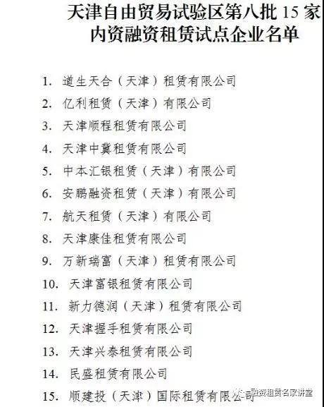 天津自贸区第八批15家内资融资租赁试点企业名单发布