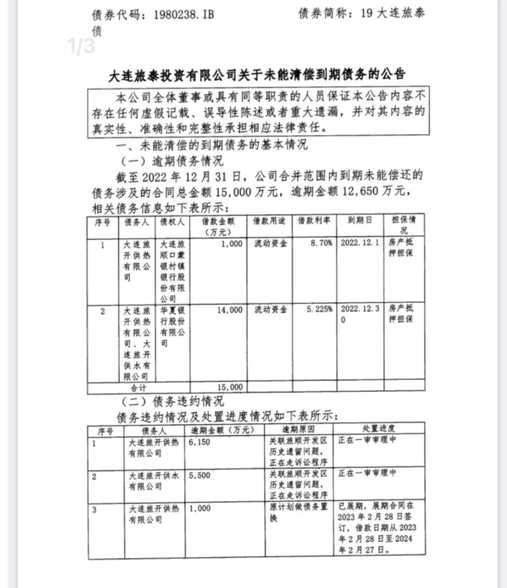6月21日,大连旅泰投资有限公司公告,截至2022年12月31日,公司合并范围内到期未能偿还的债务涉及的合同总金额15,000万元,逾期金额12,650万元。