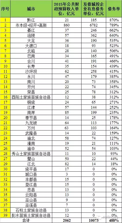 由于重庆辖区区县较多,在整体债务率高的情况下,内部也存在差异。经过整理,把重庆地区的所有发债城投企业按照区县归集,以更广的口径(发债城投企业2015年有息债务规模和地方公共财政收入)来计算债务率,从而得出了重庆38个区县以及市本级债务率的比较表。