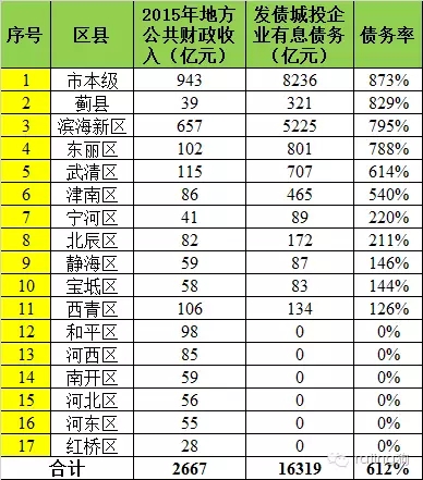 从天津各区县数据来看,市本级占了债务规模的一半,所以债务率高居榜首,实力较强的滨海新区(数据经过调整,扣除上交市级部分)、东丽区、武清区等债务水平也非常高。天津还有6个区未发行城投债。