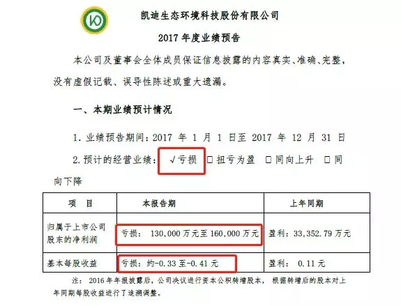 目前,凯迪生态因筹划重组正在停牌。凯迪生态2017年年报几近延迟披露,目前尚未有具体公布日期,倘若在6月份不能完成公布将面临退市。不过,凯迪生态已经发布了《2017年度业绩预告》,称公司拟对部分资产进行资产减值,由此将导致公司2017年归母净利润亏损13亿元至16亿元。业绩变动具体原因为报告期内,公司拟对蓝光电厂、不再继续投资的电厂、祁东电厂的资产计提减值准备。