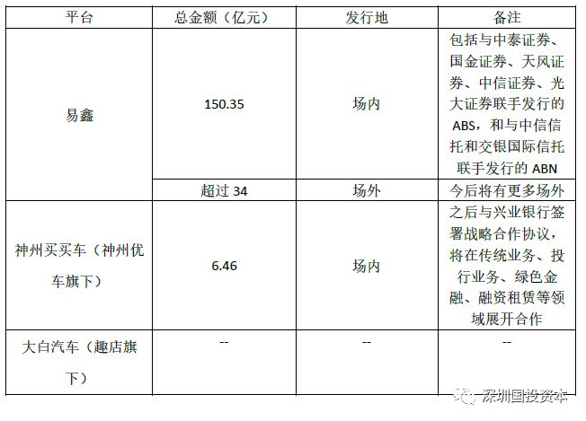 除了股权融资和合作带来的赋能,汽车融资租赁公司也在谋求其他的低成本资金。ABS在这两年开始出现并将成为一个潮流。在一行两会及交易商协会认定的ABS产品发行市场(包括全国银行间债券市场、沪深证券交易所、保险资产登记交易平台)被称为场内,而在例如地方金融资产交易所、地方股权交易中心、互联网金融平台、机构间私募产品报价与服务系统等市场发行的为场外。
